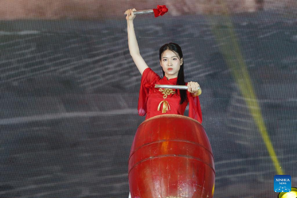 A contestant performs drumming during the final round of the northern and central section of the 17th Chinese Bridge Chinese Proficiency Competition for Foreign High School Students in Hanoi, Vietnam, May 26, 2024. (Xinhua/Hu Jiali)