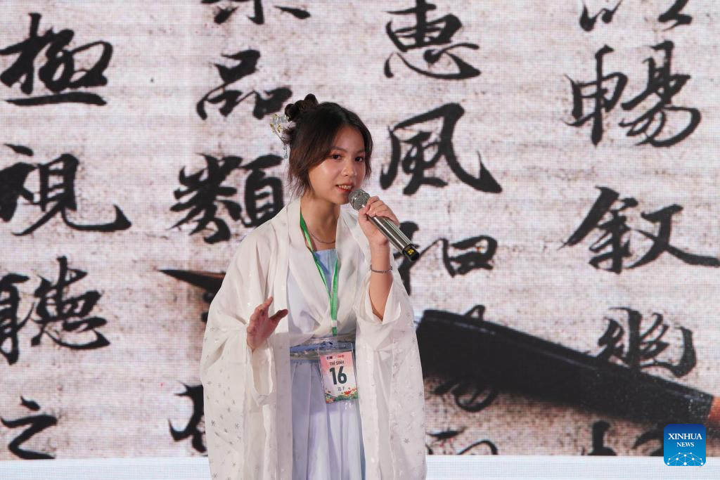 A contestant gives a speech during the final round of the northern and central section of the 17th Chinese Bridge Chinese Proficiency Competition for Foreign High School Students in Hanoi, Vietnam, May 26, 2024. (Xinhua/Hu Jiali)