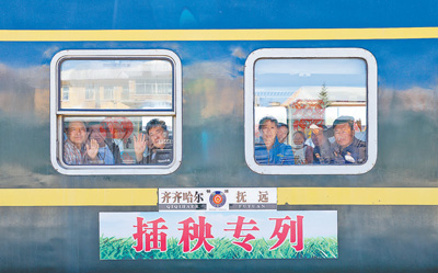 Every year, after completing their own farm work, many farmers opt to supplement their income by transplanting rice seedlings in the Sanjiang Plain, travelling to their destinations by train.