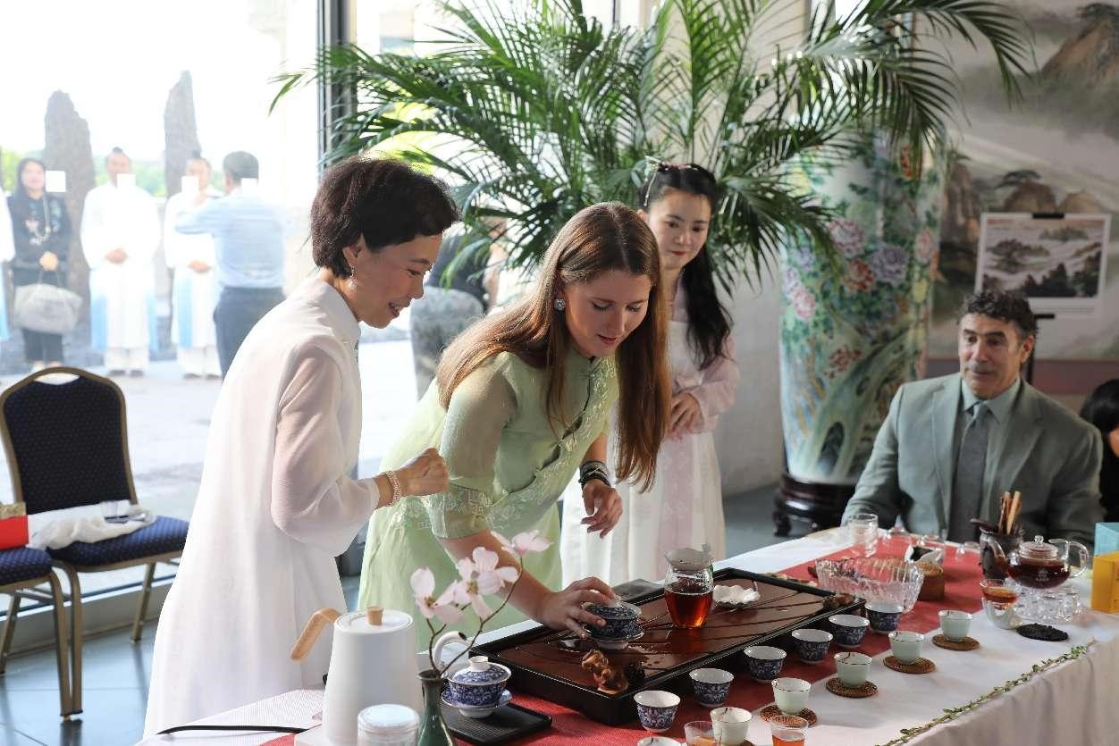 Guests experience Chinese tea culture and the charm of China's Hubei province at the "Tea for Harmony: Yaji Cultural Salon" in Washington, co-hosted by the Chinese Embassy in the United States, the Hubei Provincial Department of Culture and Tourism and Washington-based Museum of Chinese in America, May 21. (People's Daily/Li Zhiwei)