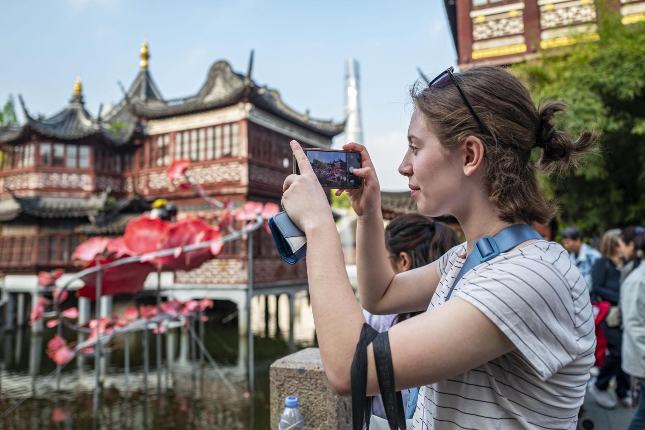 A delegation from Muscatine High School in the United States went on a study tour to China in April 2024. Photo shows a student of the delegation taking photos in the Yuyuan Garden, Shanghai. (People's Daily Online/Wang Chu)