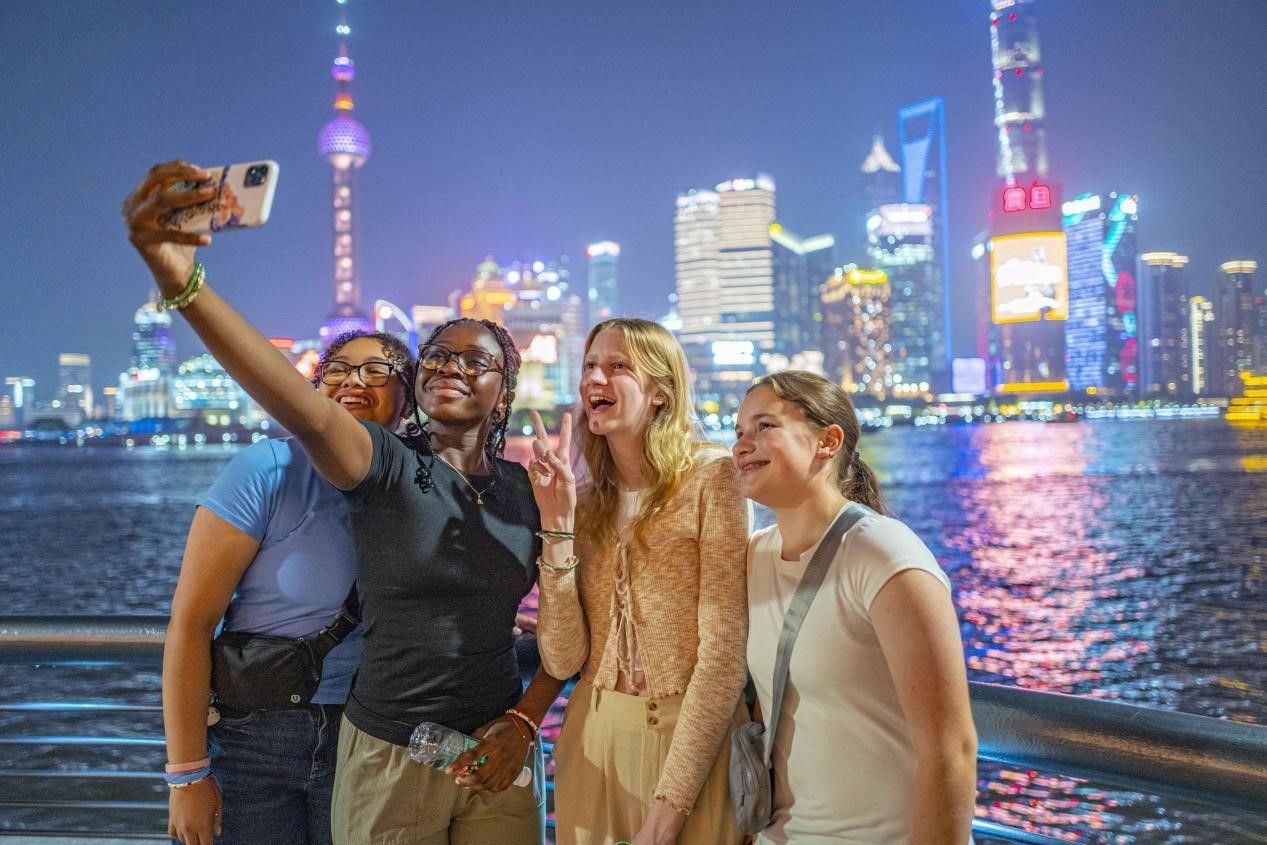 Students of a delegation from Muscatine High School visiting China pose for a picture in the Bund, Shanghai, April 23, 2024. (People's Daily Online/Wang Chu)