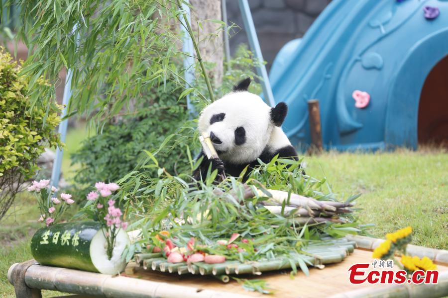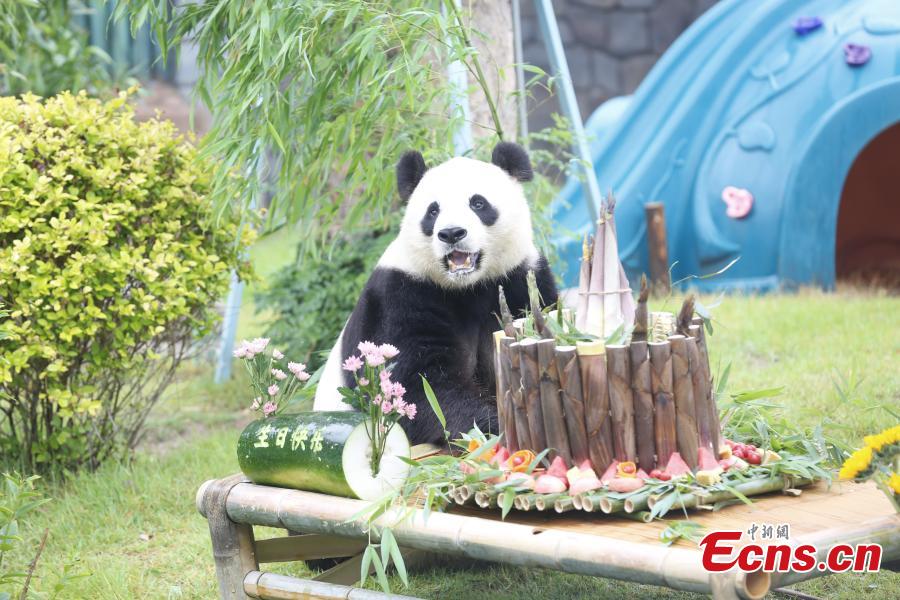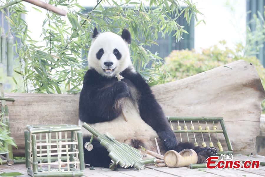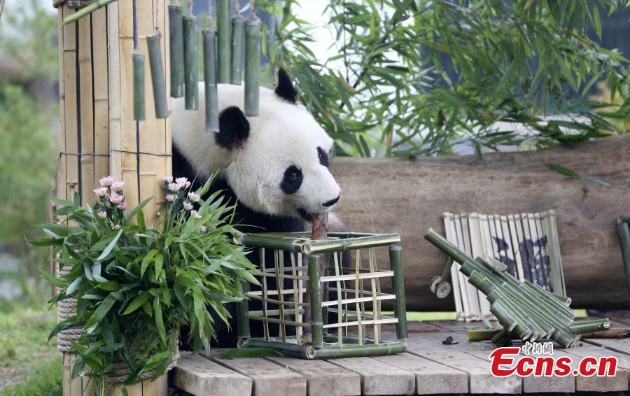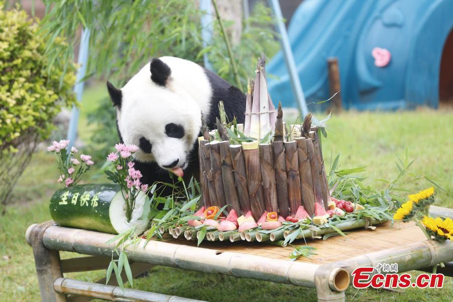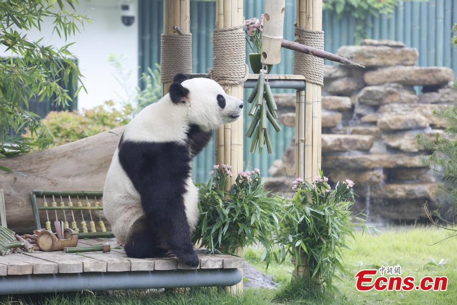 Giant panda Ya Ji enjoys a special cake made of bamboo shoots, apples and carrots to celebrate its 10th birthday at Jinan Zoo, east China's Shandong Province, May 26, 2024. (Photo: China News Service/Guo Ling)