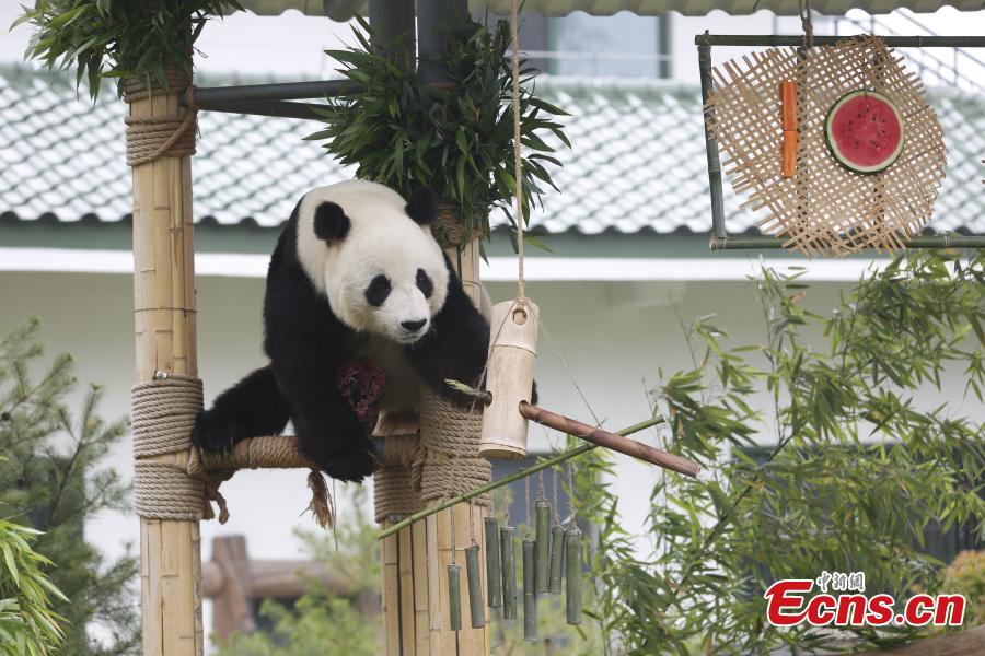 Giant panda Ya Ji plays at the outdoor arena of Jinan Zoo, east China's Shandong Province, May 26, 2024. (Photo: China News Service/Guo Ling)