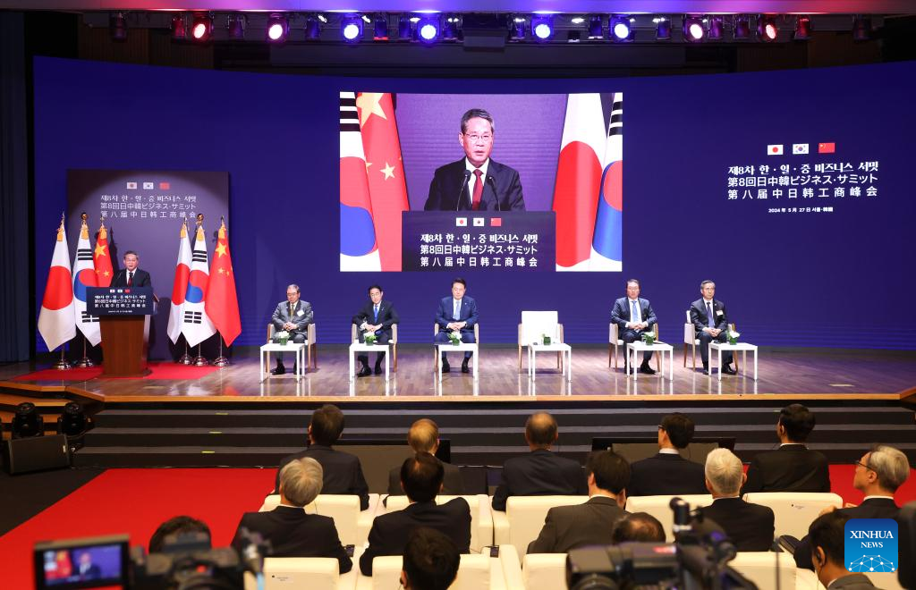 Chinese Premier Li Qiang speaks at the eighth business summit among China, Japan and South Korea, in Seoul, South Korea, May 27, 2024. Li attended the business summit with South Korean President Yoon Suk-yeol and Japanese Prime Minister Fumio Kishida on Monday. (Xinhua/Liu Weibing)