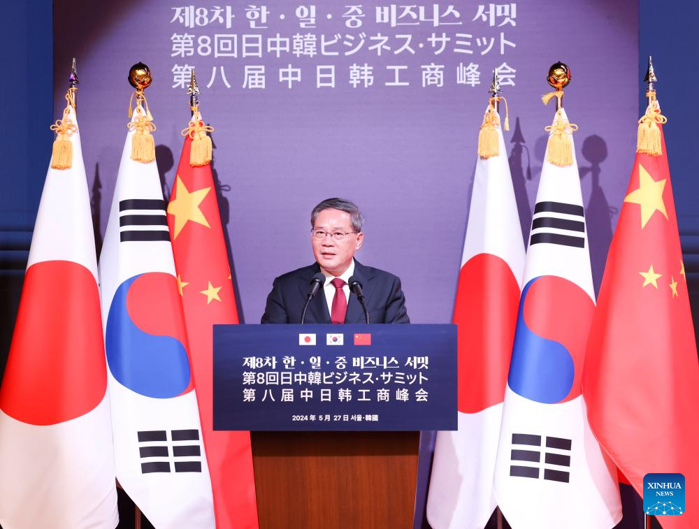 Chinese Premier Li Qiang speaks at the eighth business summit among China, Japan and South Korea, in Seoul, South Korea, May 27, 2024. Li attended the business summit with South Korean President Yoon Suk-yeol and Japanese Prime Minister Fumio Kishida on Monday. (Xinhua/Pang Xinglei)