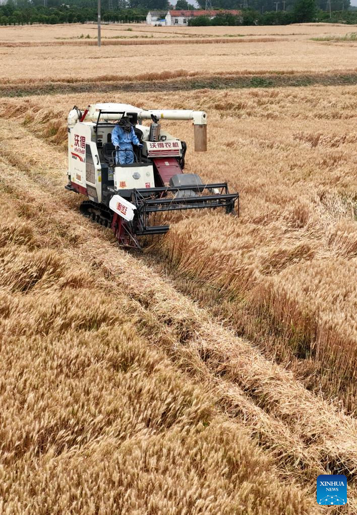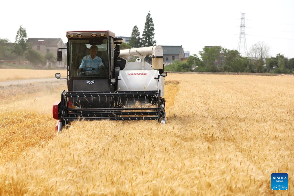 A farmer drives a harvester through a wheat field in Jinxing Village of Yuxin Township, Jiaxing City of east China's Zhejiang Province, May 26, 2024. (Photo by Jin Peng/Xinhua)