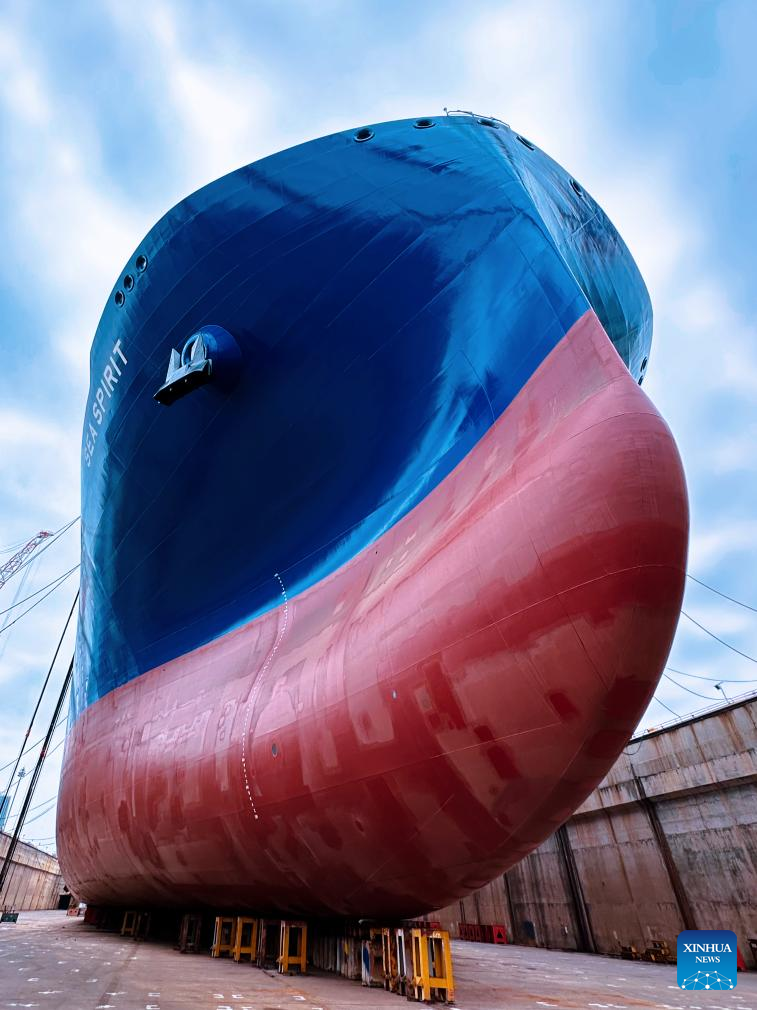 This photo provided by Dalian Shipbuilding Industry Co., Ltd. (DSIC) shows a domestically developed liquefied natural gas (LNG) carrier with a payload capacity of 175,000 cubic meters being built in Dalian, northeast China's Liaoning Province on May 24, 2024. (DSIC/Handout via Xinhua)