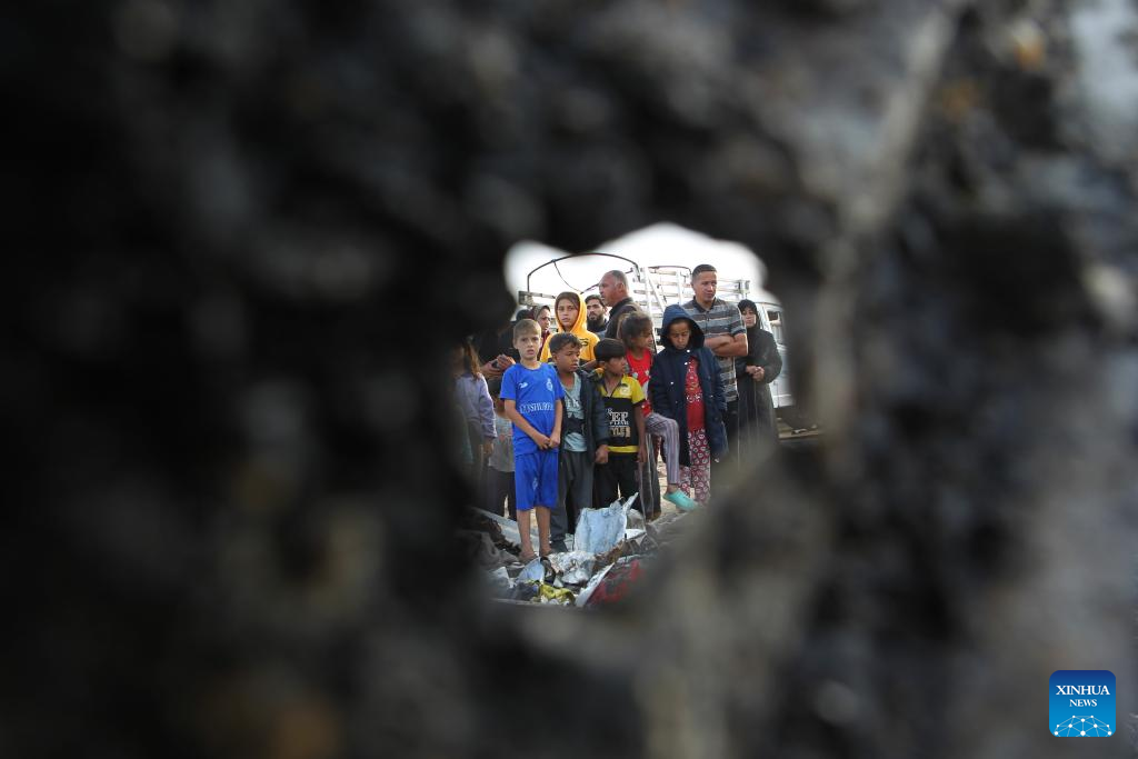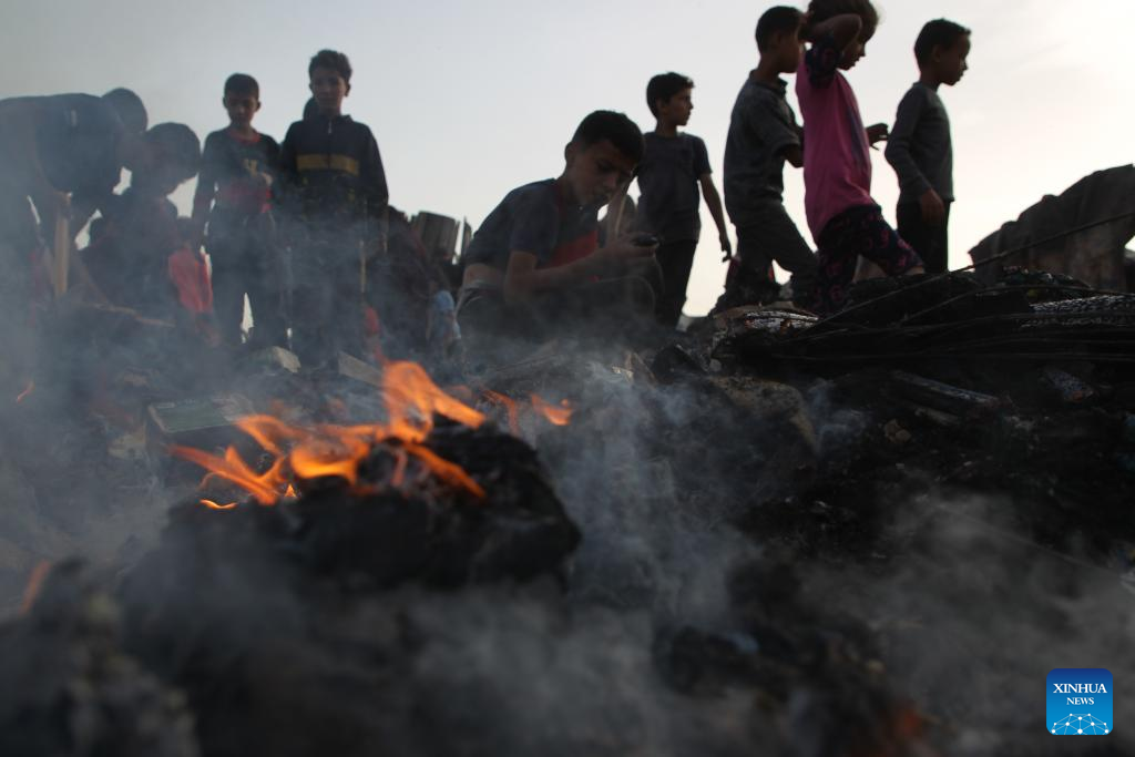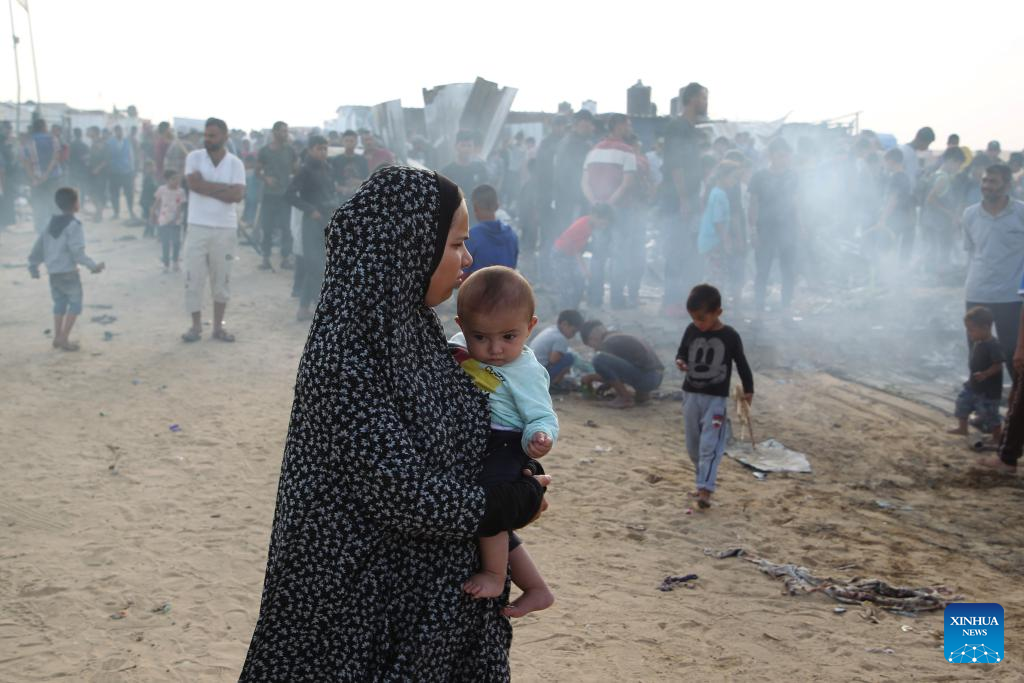 People look on at the site of an Israeli strike on a camp for displaced people in Rafah in the southern Gaza Strip, May 27, 2024. At least 40 people were killed and some others injured on Sunday evening in Israel's bombing of tents in northwestern Rafah, the southernmost city of the Gaza Strip, the Palestinian official news agency WAFA reported. (Photo by Khaled Omar/Xinhua)