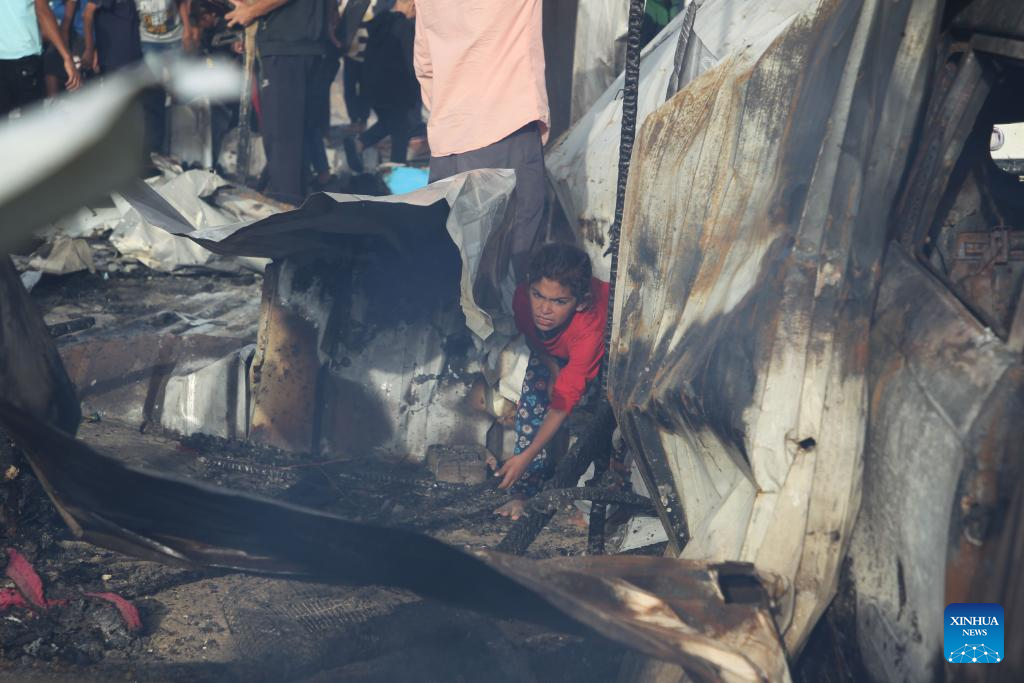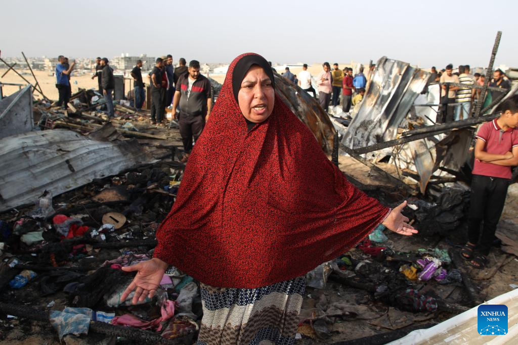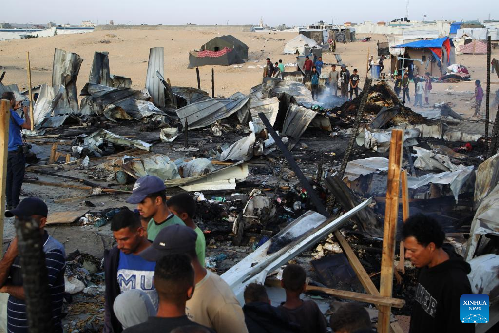 People are seen at the site of an Israeli strike on a camp for displaced people in Rafah in the southern Gaza Strip, May 27, 2024. At least 40 people were killed and some others injured on Sunday evening in Israel's bombing of tents in northwestern Rafah, the southernmost city of the Gaza Strip, the Palestinian official news agency WAFA reported. (Photo by Khaled Omar/Xinhua)
