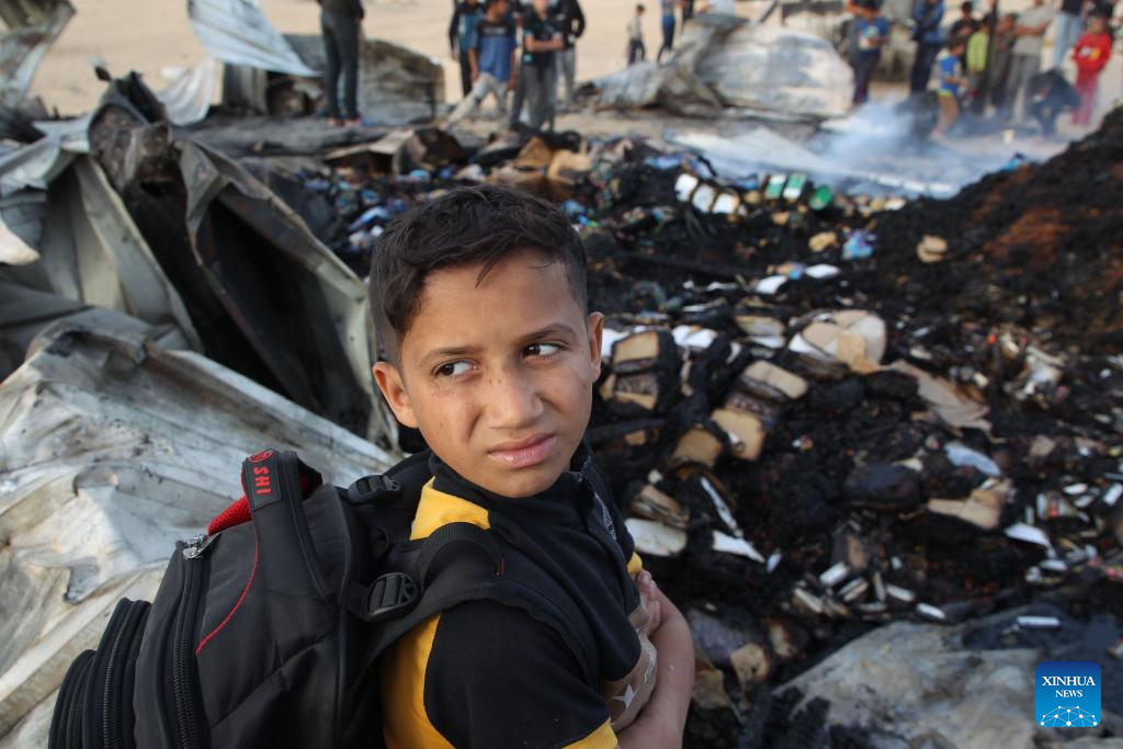 A person looks on at the site of an Israeli strike on a camp for displaced people in Rafah in the southern Gaza Strip, May 27, 2024. At least 40 people were killed and some others injured on Sunday evening in Israel's bombing of tents in northwestern Rafah, the southernmost city of the Gaza Strip, the Palestinian official news agency WAFA reported. (Photo by Khaled Omar/Xinhua)