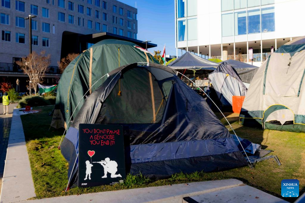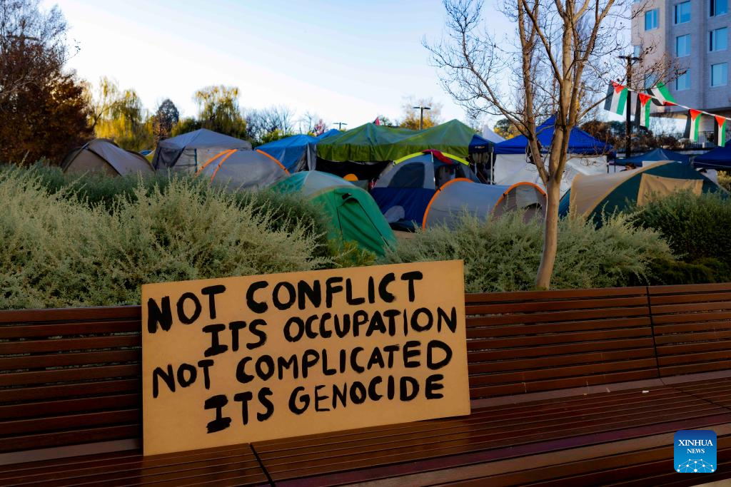 A pro-Palestine encampment is seen at the Australian National University (ANU) in Canberra, Australia, May 27, 2024. (Photo by Chu Chen/Xinhua)