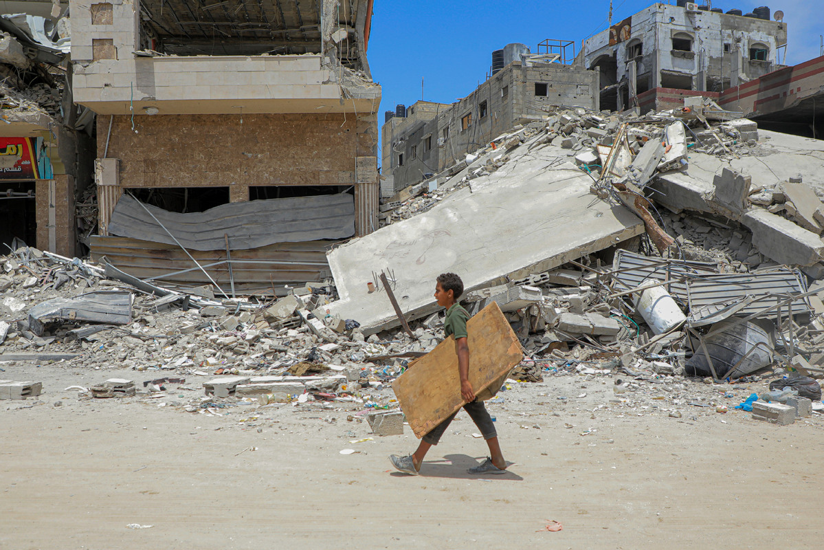 A child walks past debris in the southern Gaza Strip city of Rafah, May 22, 2024. [Photo/Xinhua]