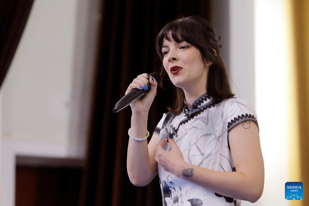 Romanian student Ioana Mihai, the winner of the grand prize of Romania Finals of the 23rd "Chinese Bridge" Chinese proficiency competition for non-Chinese college students, demonstrates her talent in Bucharest, Romania, May 26, 2024. (Photo by Cristian Cristel/Xinhua)