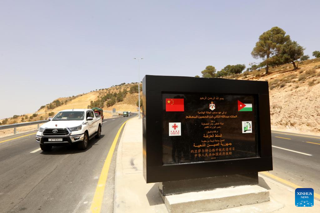 Vehicles pass a sign of a China-funded road project in As-Salt, Jordan, on May 27, 2024. (Photo by Mohammad Abu Ghosh/Xinhua)