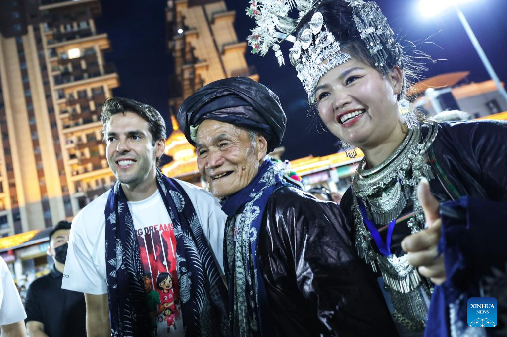 Brazil's former football player Kaka (L) poses with local people during a football match of the Village Super League in Rongjiang County of southwest China's Guizhou Province, May 27, 2024. (Xinhua/Liu Xu)