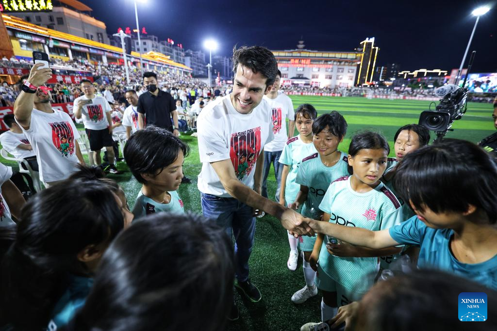 Brazil's former football player Kaka (C) greets local players during the halftime of a football match of the Village Super League in Rongjiang County of southwest China's Guizhou Province, May 27, 2024. (Xinhua/Liu Xu)