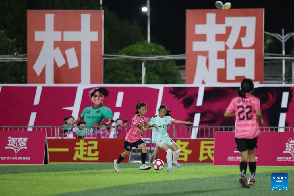 Local players compete during a football match of the Village Super League in Rongjiang County of southwest China's Guizhou Province, May 27, 2024. (Xinhua/Liu Xu)