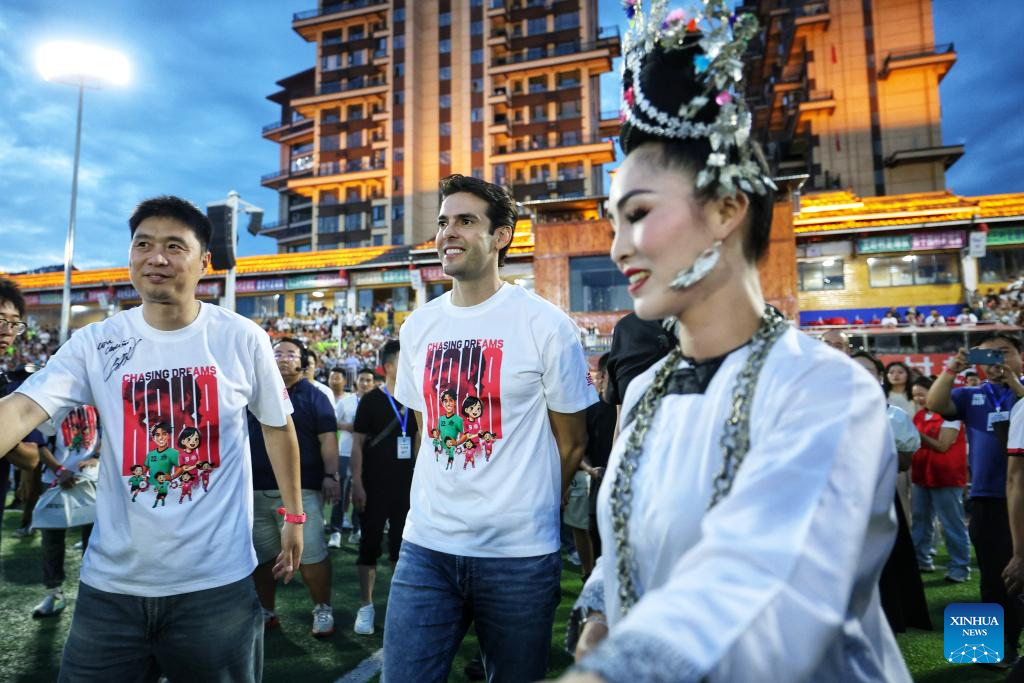 Brazil's former football player Kaka (C) is seen before a football match of the Village Super League in Rongjiang County of southwest China's Guizhou Province, May 27, 2024. (Xinhua/Liu Xu)