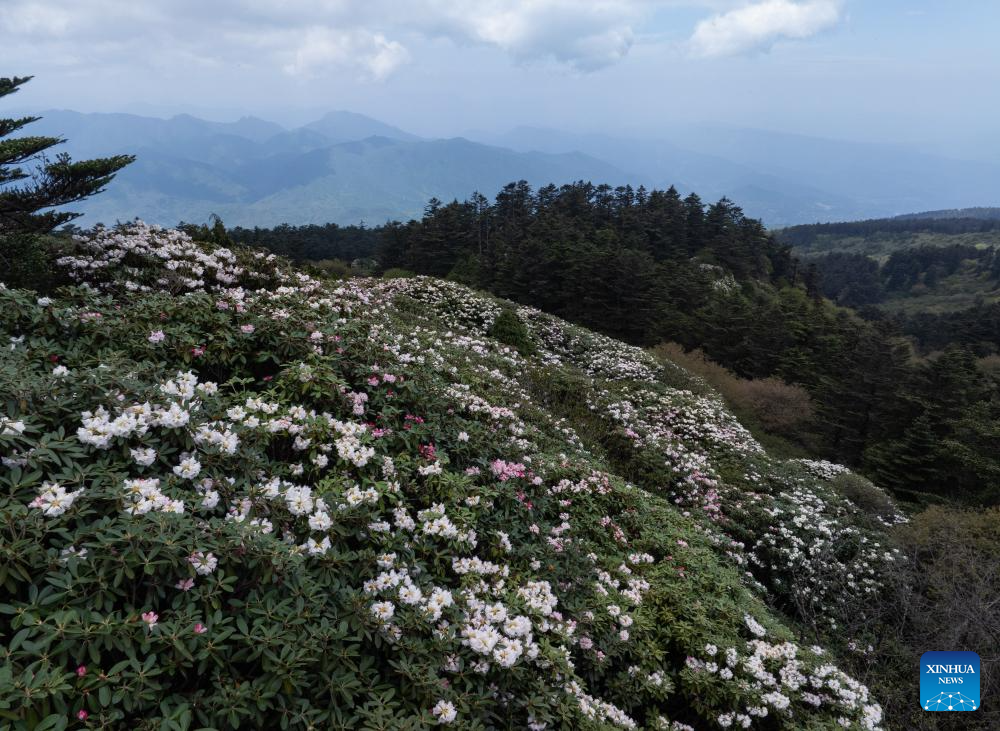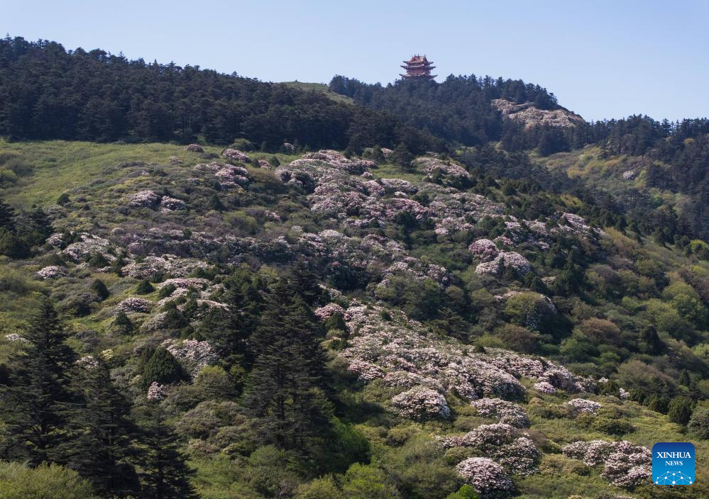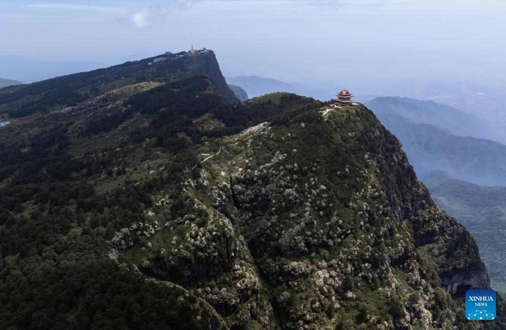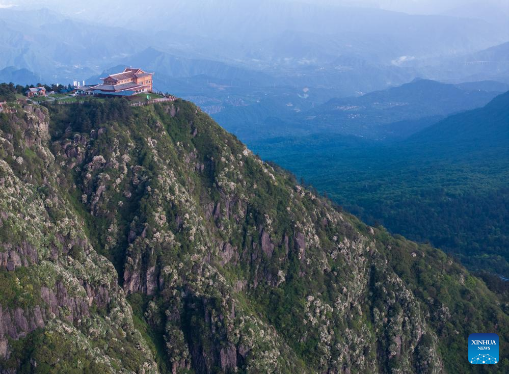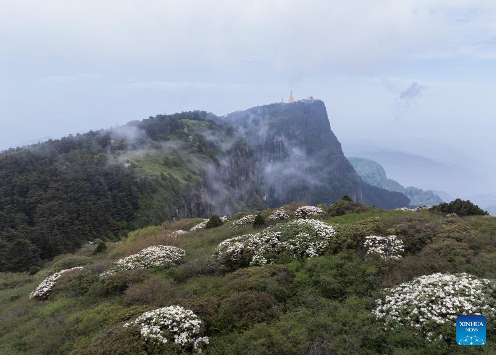 An aerial drone photo taken on May 26, 2024 shows azalea blossoms on the summit of Mount Emei in southwest China's Sichuan Province. April, May and June see the most beautiful azalea blossoms every year at Mount Emei, dubbed the "Kingdom of Azalea," home to about 30 species of this plant family. (Xinhua/Jiang Hongjing)