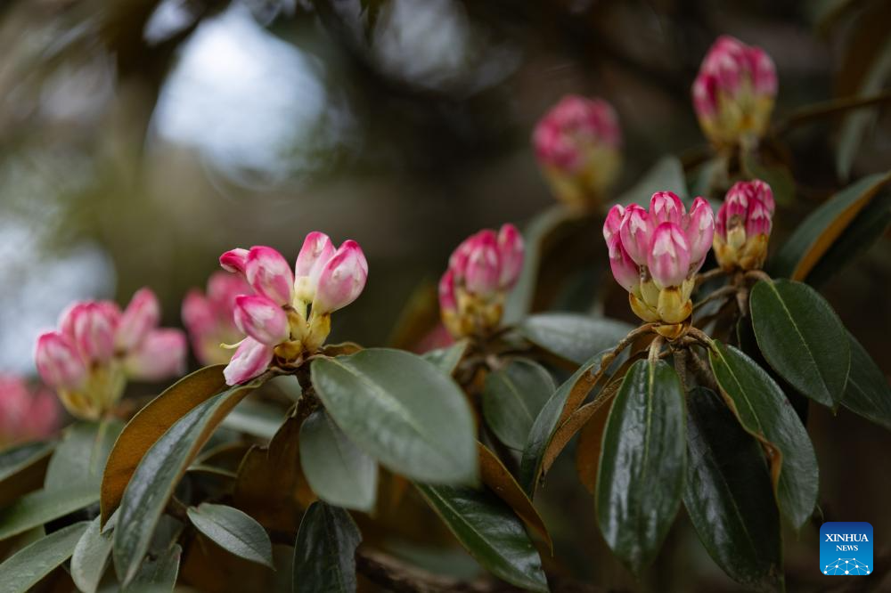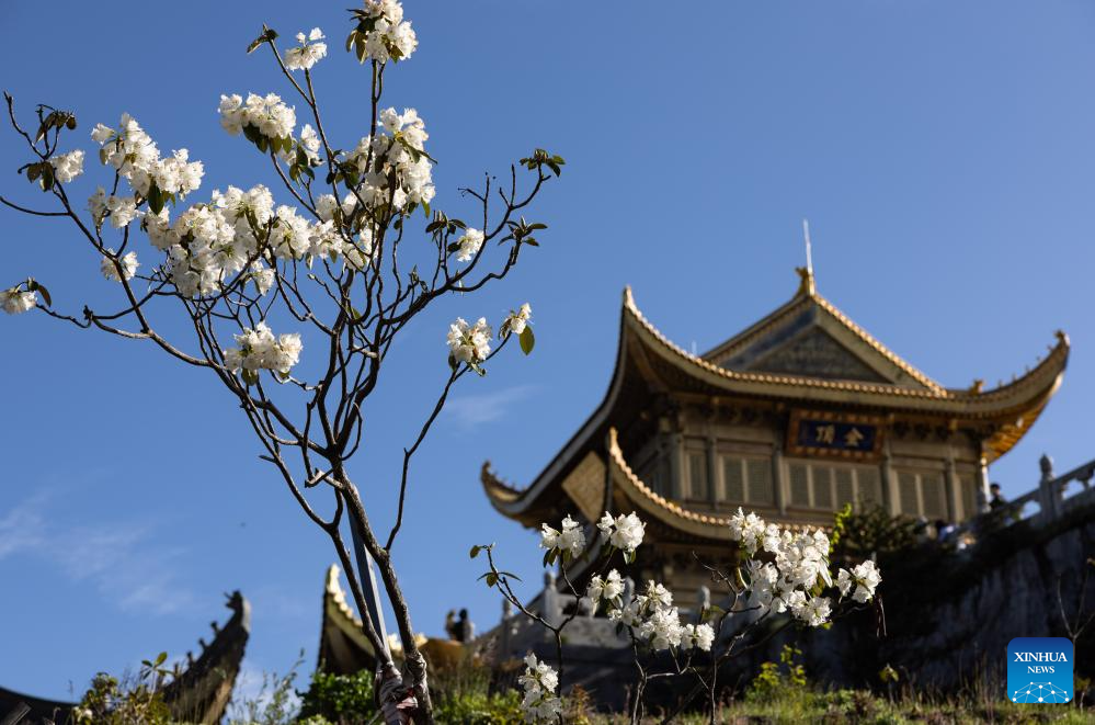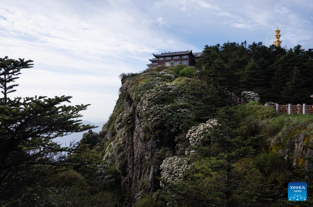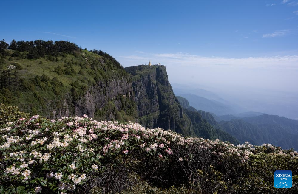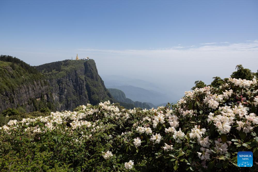 This photo taken on May 26, 2024 shows azalea blossoms on the summit of Mount Emei in southwest China's Sichuan Province. April, May and June see the most beautiful azalea blossoms every year at Mount Emei, dubbed the "Kingdom of Azalea," home to about 30 species of this plant family. (Xinhua/Jiang Hongjing)