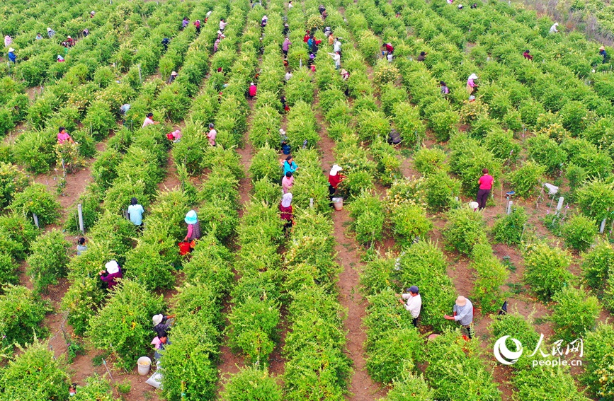 Farmers pick honeysuckle flowers in the honeysuckle base in Shiqiao village in Haozhai township, Sheqi county of Nanyang, central China’s Henan Province. (People’s Daily Online/Xin Jing)