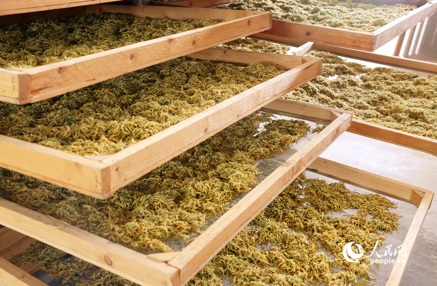 Photo shows honeysuckle flowers that are about to be dried. (People’s Daily Online/Xin Jing)