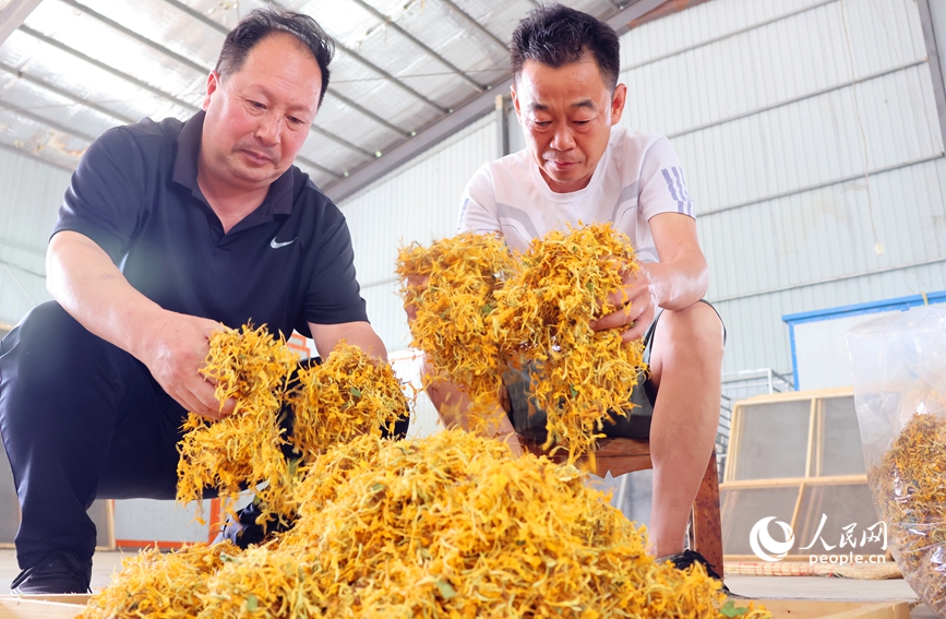 Farmers process dried honeysuckle flowers. (People’s Daily Online/Xin Jing)