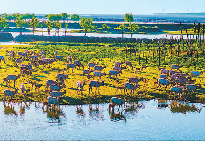 A herd of milu deer at a wetland in Dafeng district, Yancheng city, east China's Jiangsu Province. (People's Daily Online/Zhang Lianhua)