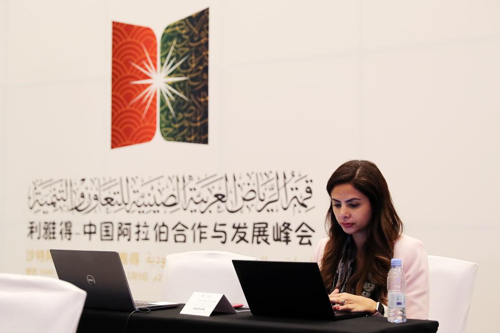 A journalist works in a media center in Riyadh, Saudi Arabia, Dec. 7, 2022. The first China-Arab States Summit and the China-Gulf Cooperation Council summit was held in Riyadh. (Xinhua/Wang Dongzhen)
