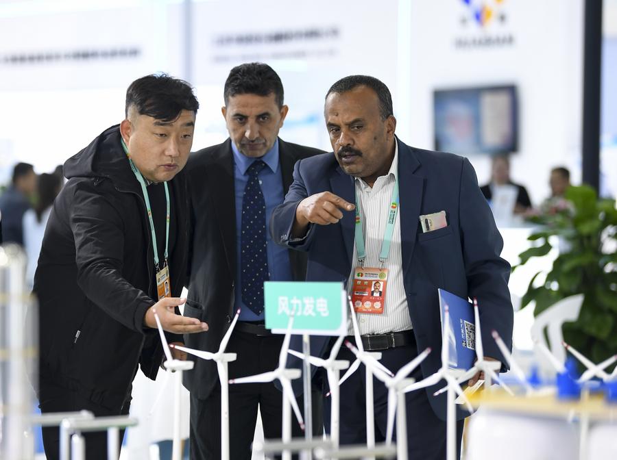 A guest (R) learns about a wind power generation project at the sixth China-Arab States Expo in Yinchuan, northwest China's Ningxia Hui Autonomous Region, Sept. 22, 2023. (Xinhua/Feng Kaihua)