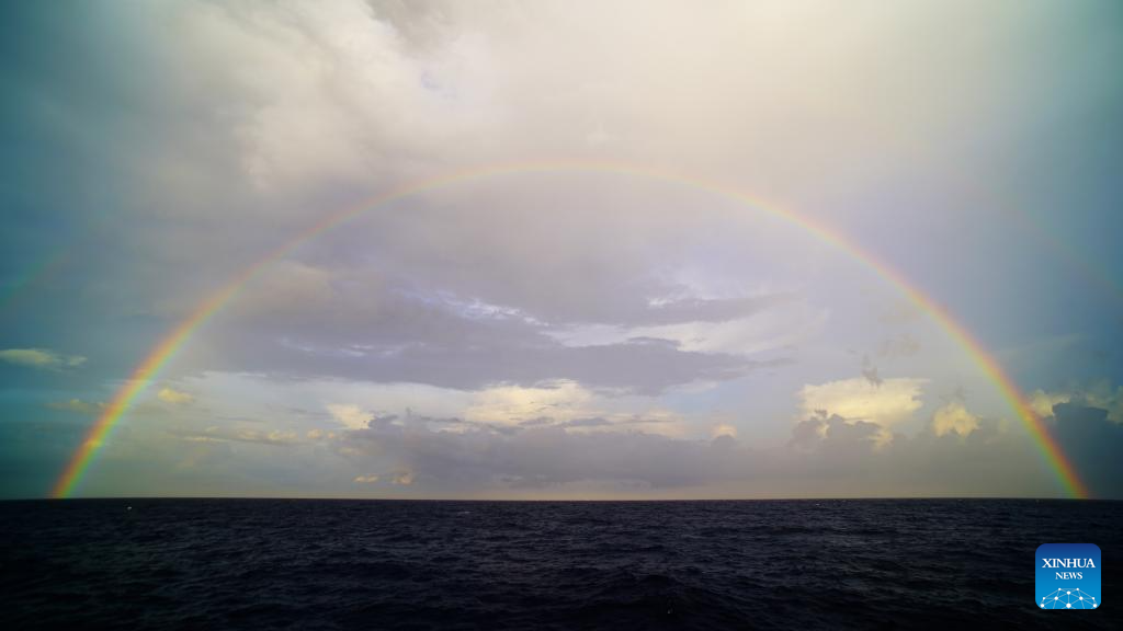 This photo taken on May 3, 2024 shows a view with a rainbow in the South China Sea. (Xinhua/Yuan Shuai)