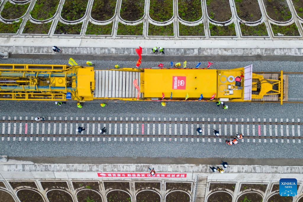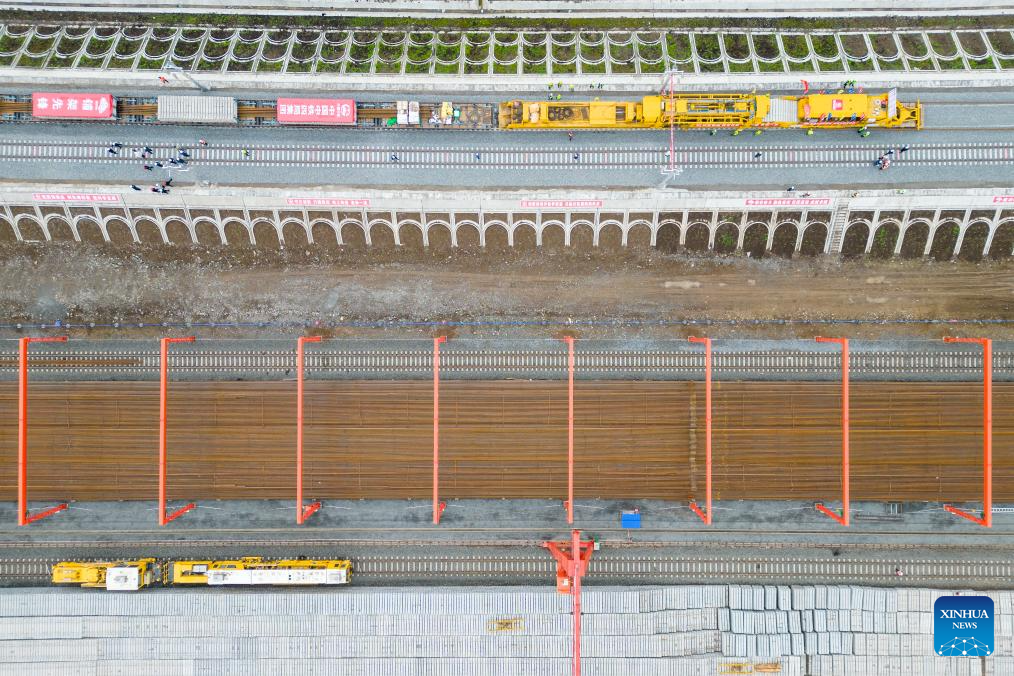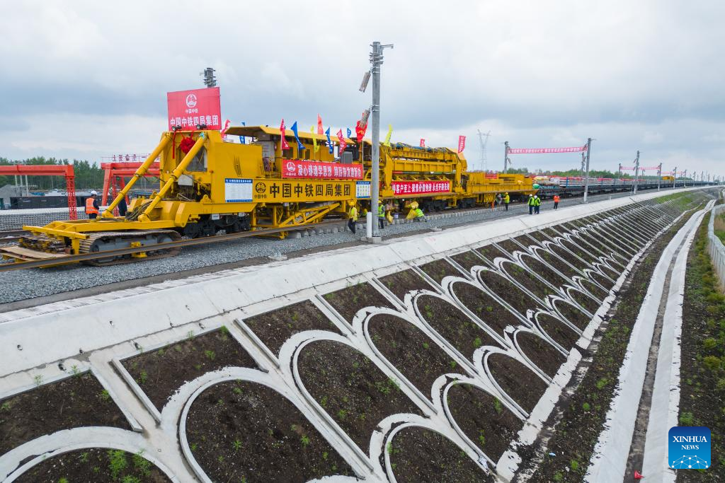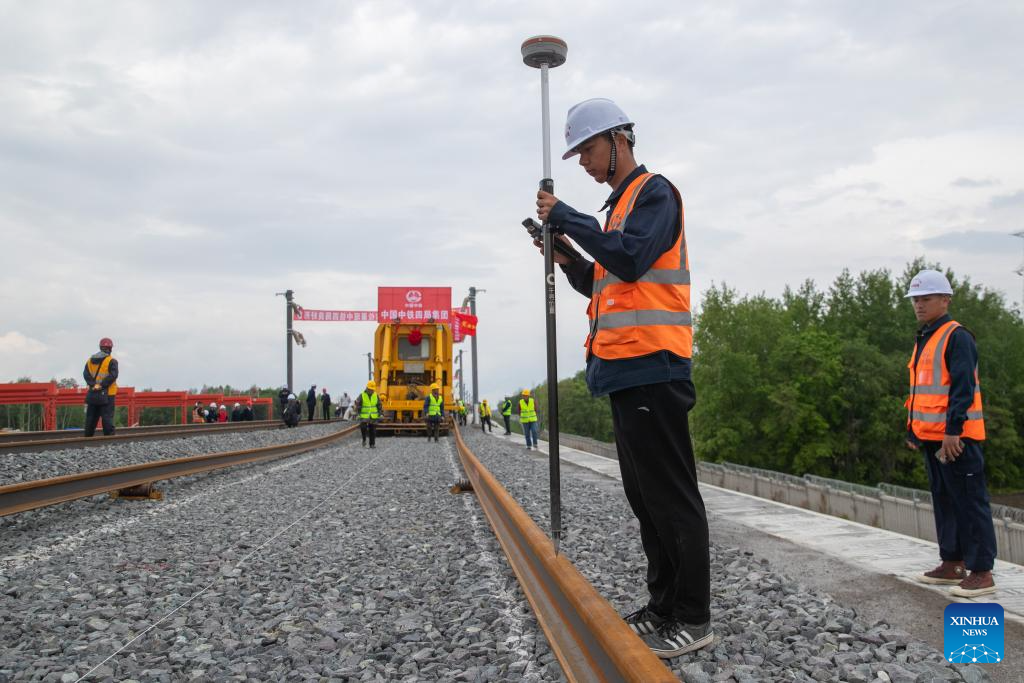 Rail constructors work at a construction site in the Tieli to Yichun section of the Harbin-Yichun high-speed railway in northeast China's Heilongjiang Province, May 28, 2024. Track-laying for Harbin-Yichun high-speed railway commenced on Tuesday. The 318-km rail route connects Harbin, Tieli, Yichun, and a few other cities, allowing a designed train speed of 250 km per hour. It is China's northernmost high-speed railway under construction. (Xinhua/Zhang Tao)