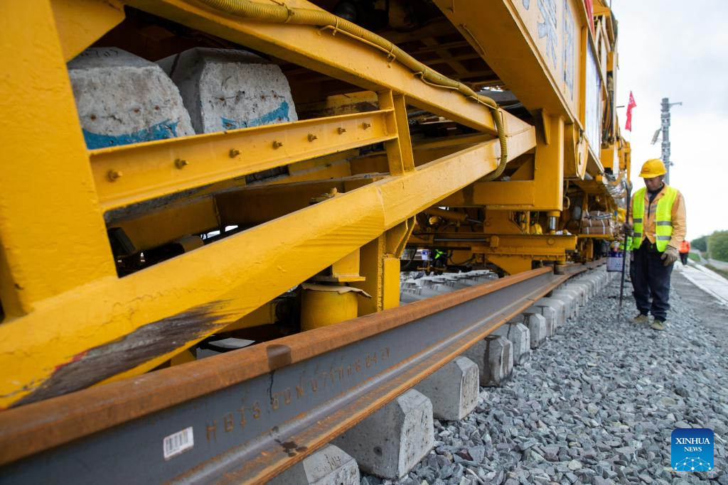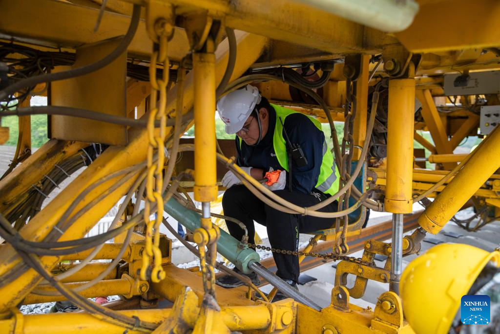 A rail constructor works at a construction site in the Tieli to Yichun section of the Harbin-Yichun high-speed railway in northeast China's Heilongjiang Province, May 28, 2024. Track-laying for Harbin-Yichun high-speed railway commenced on Tuesday. The 318-km rail route connects Harbin, Tieli, Yichun, and a few other cities, allowing a designed train speed of 250 km per hour. It is China's northernmost high-speed railway under construction. (Xinhua/Zhang Tao)