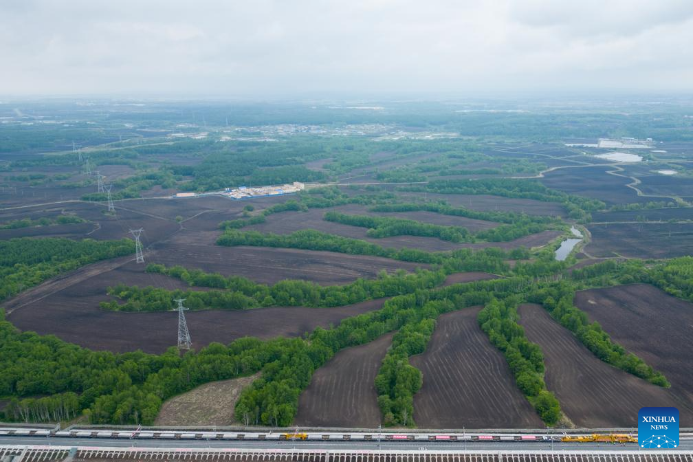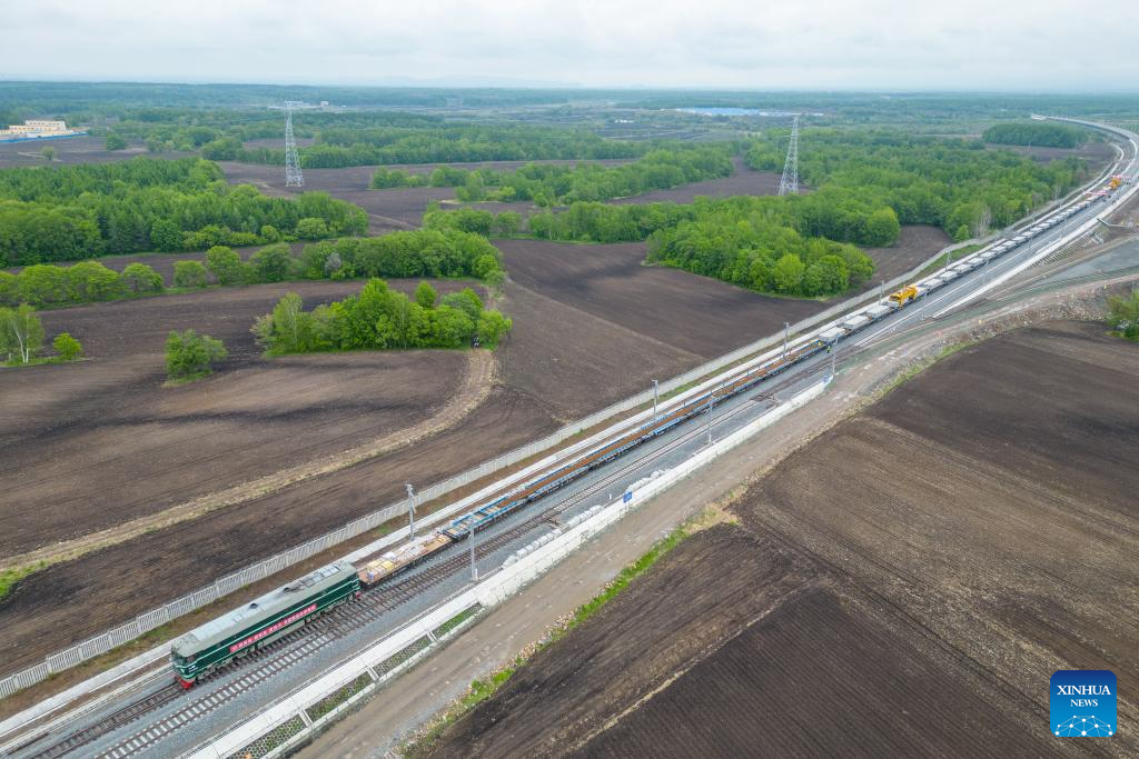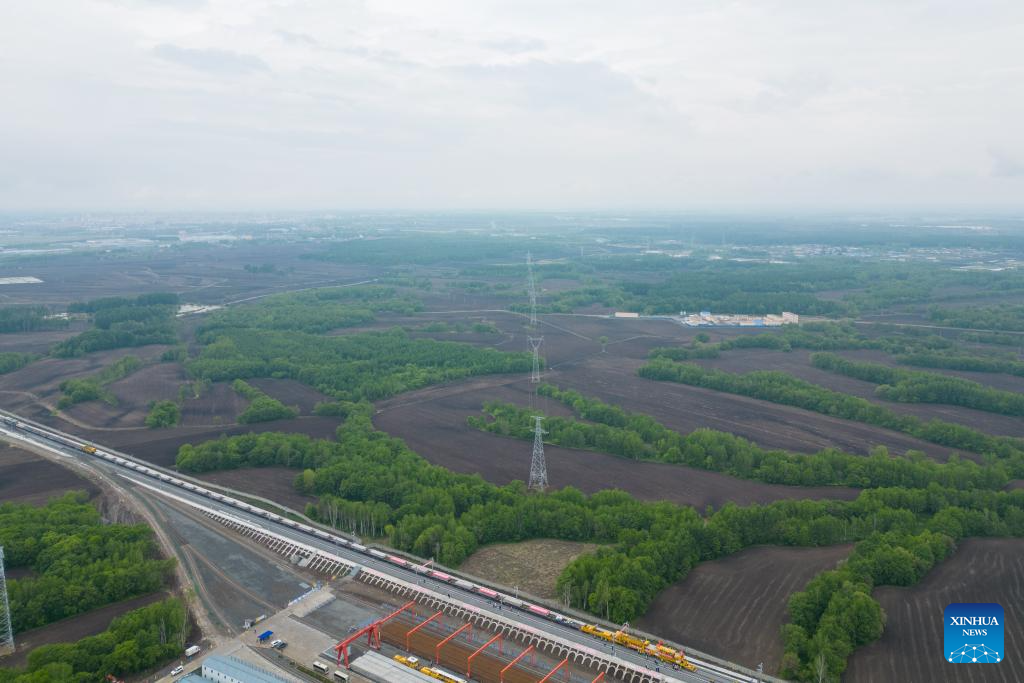 A drone photo shows a construction site in the Tieli to Yichun section of the Harbin-Yichun high-speed railway in northeast China's Heilongjiang Province, May 28, 2024. Track-laying for Harbin-Yichun high-speed railway commenced on Tuesday. The 318-km rail route connects Harbin, Tieli, Yichun, and a few other cities, allowing a designed train speed of 250 km per hour. It is China's northernmost high-speed railway under construction. (Xinhua/Zhang Tao)