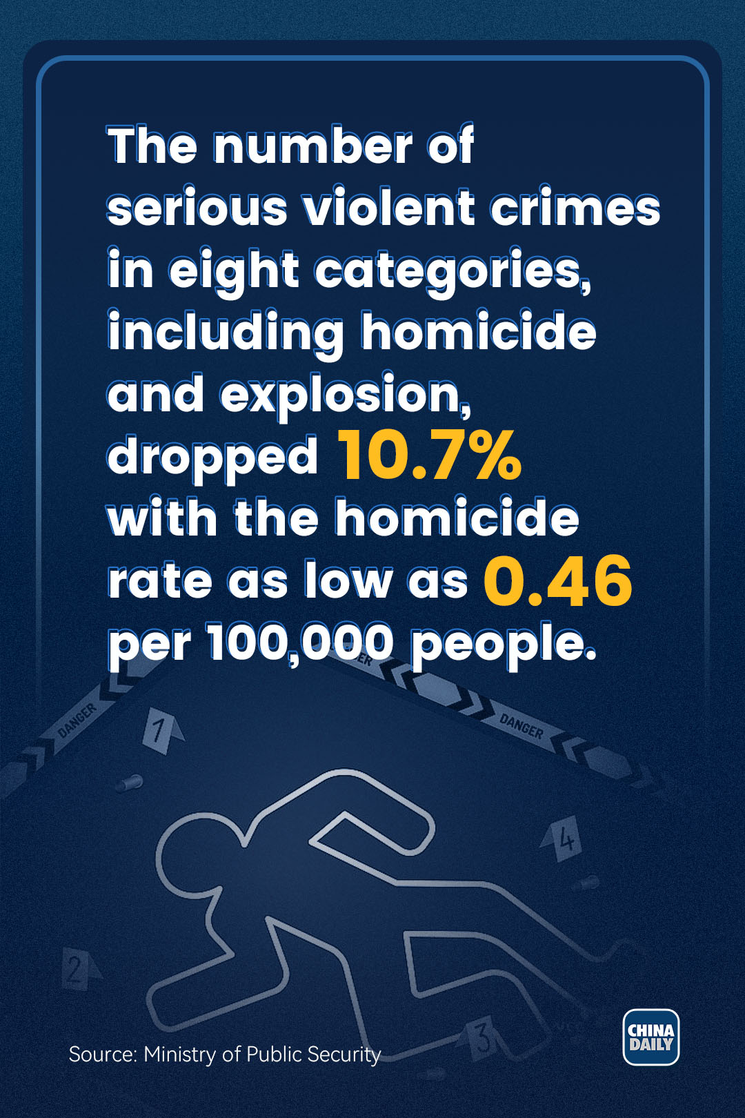 China is a country with one of the lowest crime rates, lowest homicide rates and fewest gun and explosion incidents, according to data released on Monday by the Ministry of Public Security. Here are some figures.