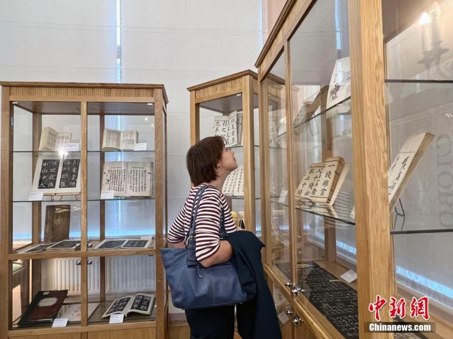 A visitor views Chinese calligraphy during an exhibition in commemoration of the 75th anniversary of diplomatic relations between China and Russia in Moscow, Russia, May 28, 2024. (Photo: China News Service/Tian Bing)