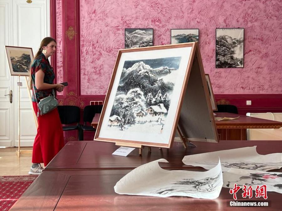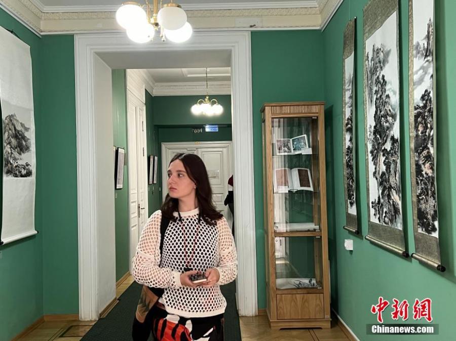 A visitor views paintings during an exhibition in commemoration of the 75th anniversary of diplomatic relations between China and Russia in Moscow, Russia, May 28, 2024. (Photo: China News Service/Tian Bing)