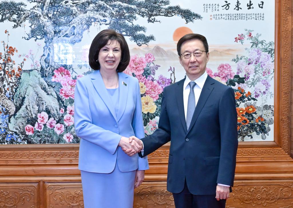 Chinese Vice President Han Zheng meets with Natalia Kochanova, chairwoman of the Council of the Republic of the National Assembly of Belarus, in Beijing, capital of China, May 29, 2024. (Xinhua/Gao Jie)