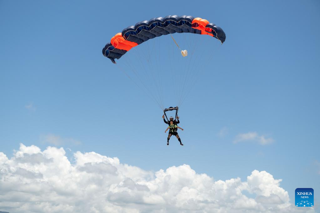 Nam Lee, an expert parachutist from the Republic of Korea, skydives with a tourist in Sanya, south China's Hainan Province, June 23, 2022. (Xinhua/Hu Zhixuan)