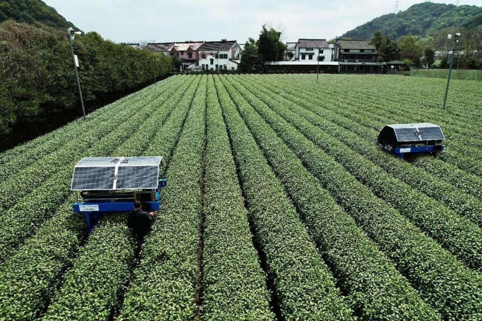 AI-enabled robots pick tea leaves in a tea garden in Xihu district, Hangzhou, east China's Zhejiang province. (People's Daily Online/Long Wei)