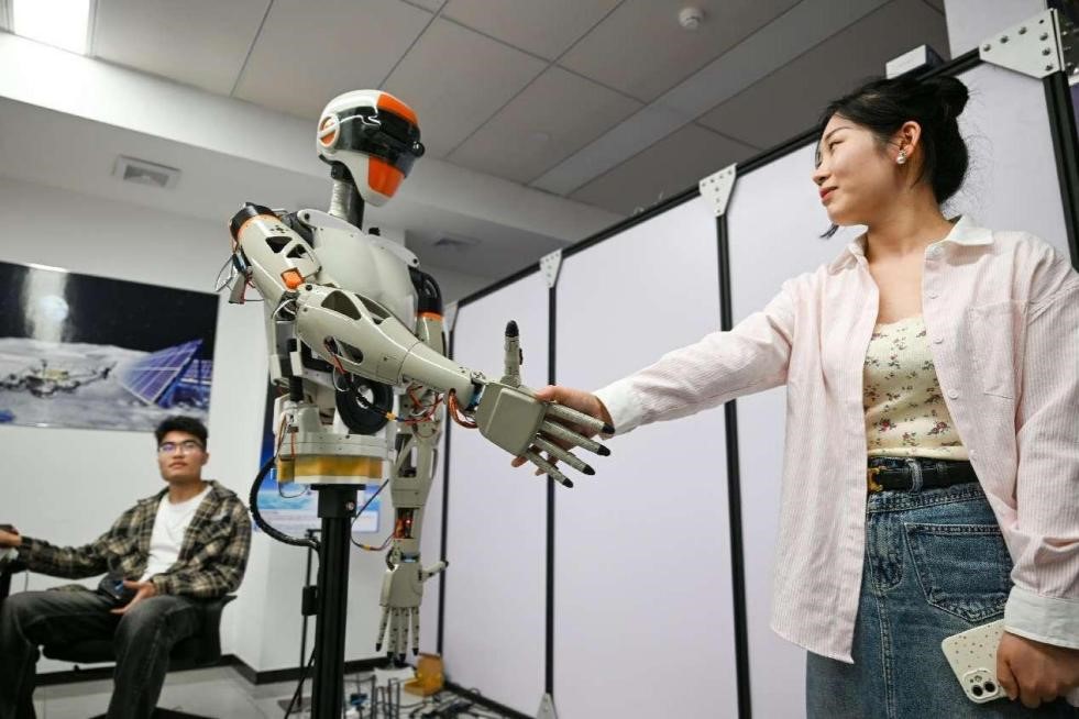 A researcher shakes hands with a humanoid robot in a laboratory of the Huzhou Institute of Zhejiang University. (People's Daily Online/Huang Yangyang)