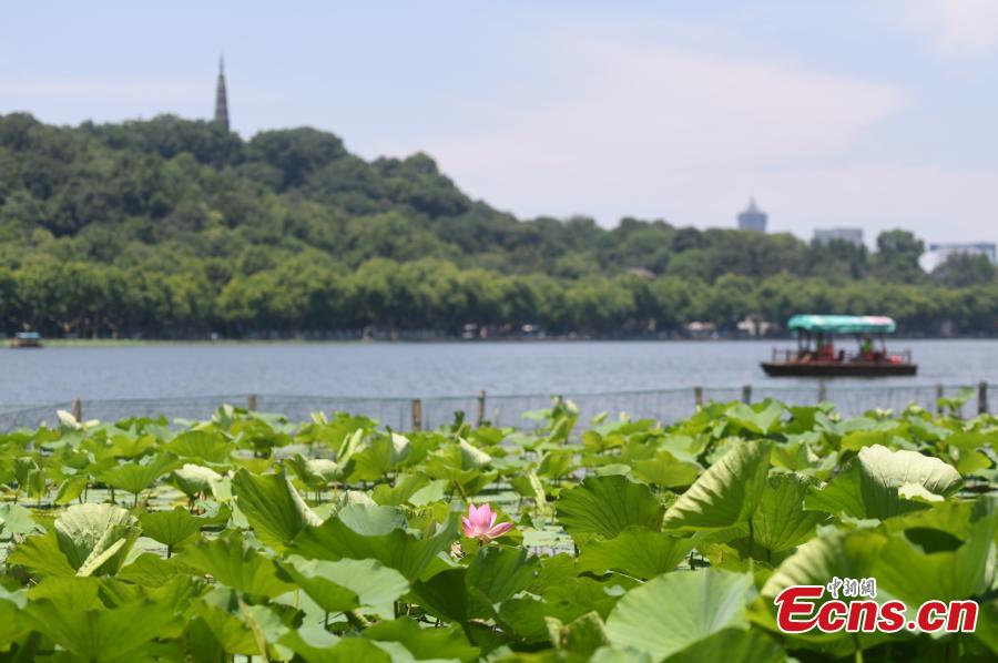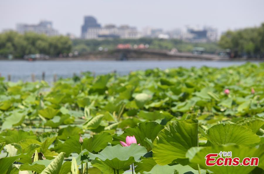 Scenery of blooming lotus flowers and leaves over West Lake in Hangzhou, east China's Zhejiang Province, May 29, 2024. (Photo: China News Service/Wang Gang)