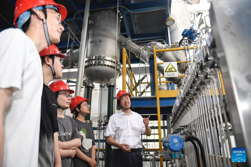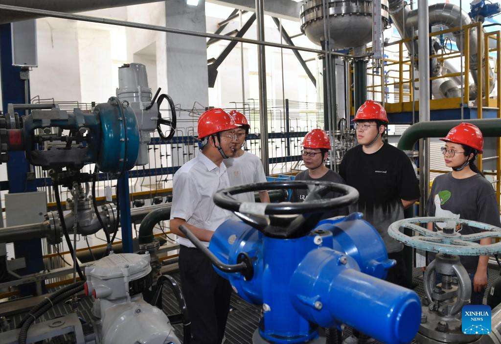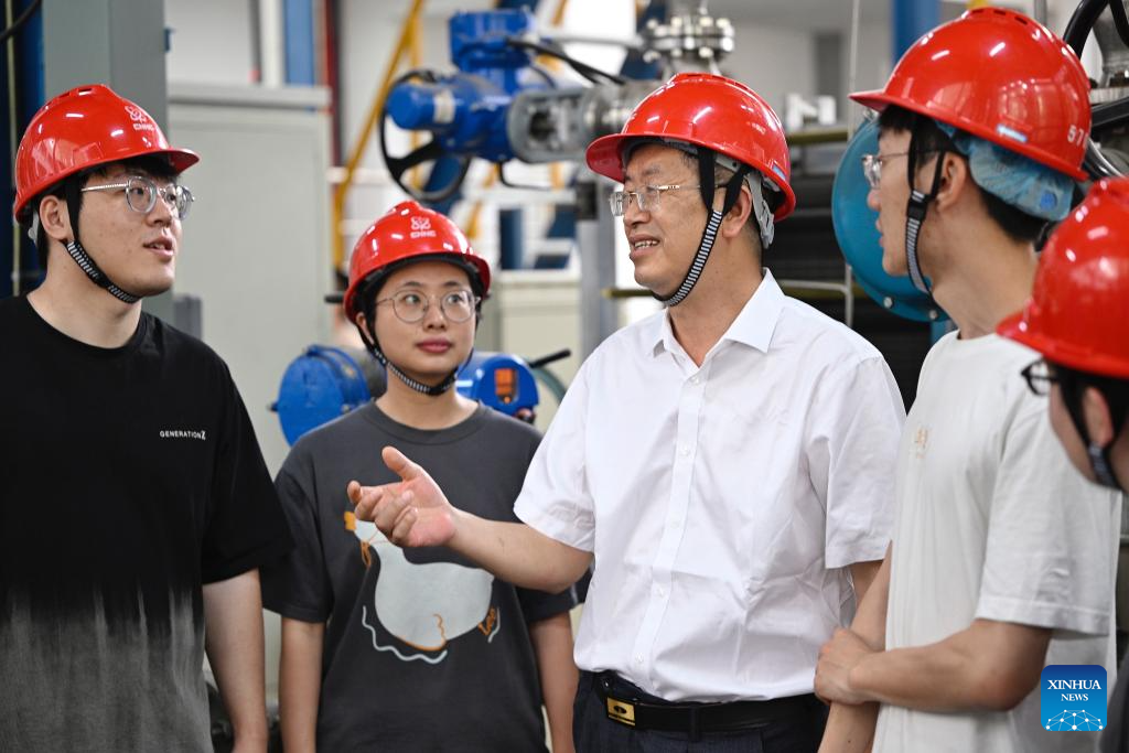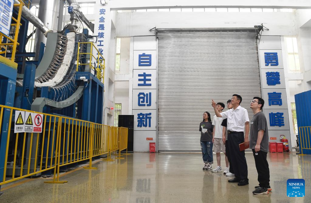 Zhong Yuanzhang (2nd R) communicates with colleagues at an experimental platform in Nuclear Power Institute of China in Chengdu, southwest China's Sichuan Province, May 24, 2024. Zhong was the deputy chief designer of Hualong One nuclear power project of the Nuclear Power Institute of China. Since his graduation from Chengdu University of Science and Technology (now Sichuan University) majoring in chemical engineering in 1986, Zhong has been engaged in reactor structure design and participated in the R&D of more than half of China's nuclear power plants. (Xinhua/Liu Kun)