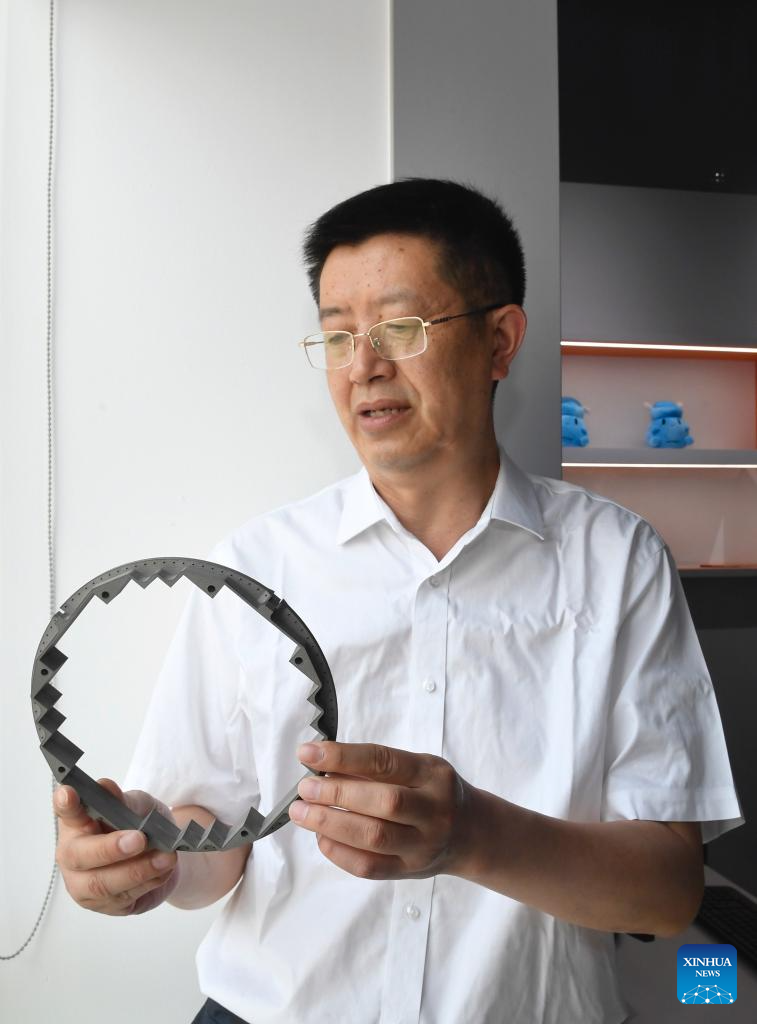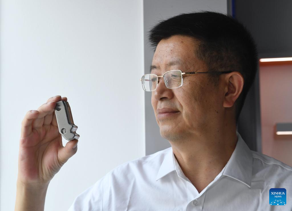 Zhong Yuanzhang shows a 3D-printed nuclear reactor part at Nuclear Power Institute of China in Chengdu, southwest China's Sichuan Province, May 24, 2024. Zhong was the deputy chief designer of Hualong One nuclear power project of the Nuclear Power Institute of China. Since his graduation from Chengdu University of Science and Technology (now Sichuan University) majoring in chemical engineering in 1986, Zhong has been engaged in reactor structure design and participated in the R&D of more than half of China's nuclear power plants. (Xinhua/Liu Kun)