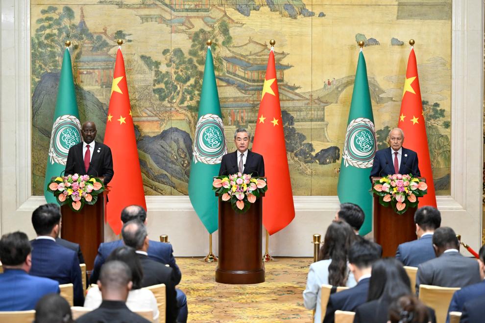 Chinese Foreign Minister Wang Yi, also a member of the Political Bureau of the Communist Party of China Central Committee, Mohamed Salem Ould Merzouk, Mauritania's minister of foreign affairs, cooperation and Mauritanians abroad, and Ahmed Aboul-Gheit, Secretary-General of the League of Arab States, meet the press after the 10th ministerial meeting of the China-Arab States Cooperation Forum, in Beijing, capital of China, May 30, 2024. (Xinhua/Yin Bogu)