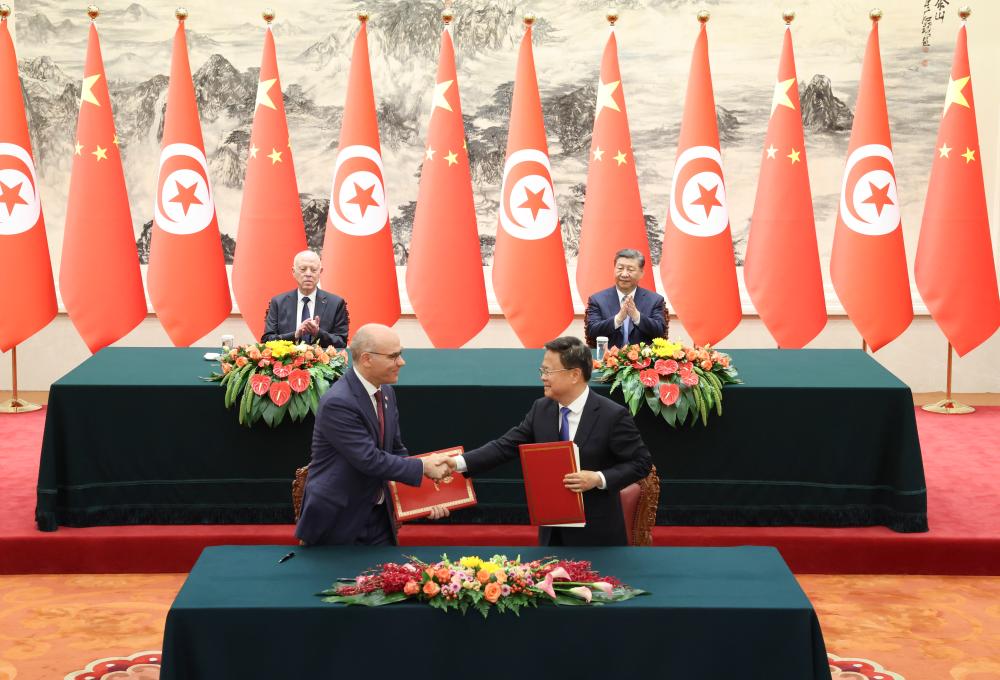 Chinese President Xi Jinping and Tunisian President Kais Saied witness the signing of multiple bilateral cooperation documents in various fields including green and low-carbon development and investment after their talks in Beijing, capital of China, May 31, 2024. Xi held talks with Kais Saied at the Great Hall of the People in Beijing on Friday. Kais Saied, who is in China on a state visit, attended the opening ceremony of the 10th ministerial conference of the China-Arab States Cooperation Forum. (Xinhua/Ding Haitao)