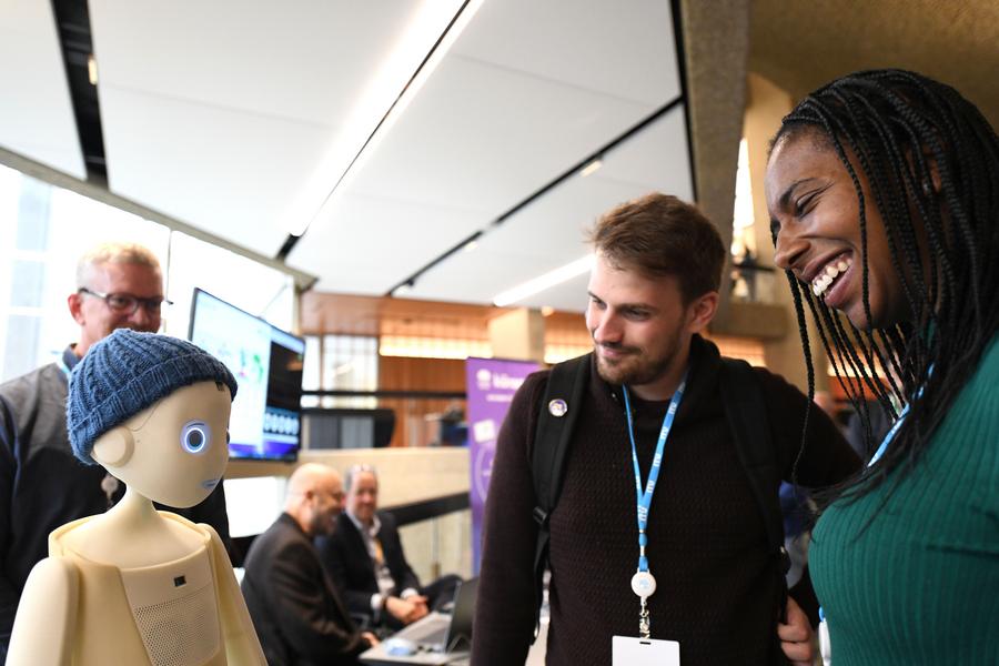 Participants interact with a robot for social care at the 2024 Artificial Intelligence (AI) for Good Global Summit in Geneva, Switzerland, May 30, 2024. (Xinhua/Lian Yi)
