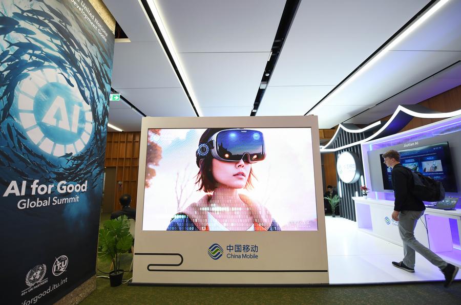 A participant visits the exhibition booth of China Mobile at the 2024 Artificial Intelligence (AI) for Good Global Summit in Geneva, Switzerland, May 30, 2024. (Xinhua/Lian Yi)