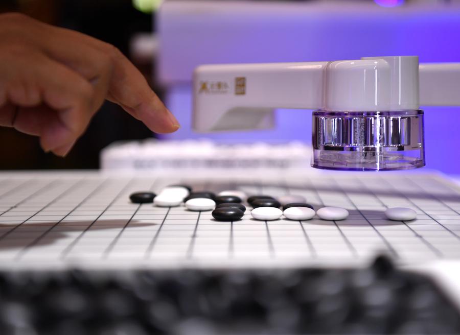 A participant plays chess with a chess-playing robot developed by China Mobile at the 2024 Artificial Intelligence (AI) for Good Global Summit in Geneva, Switzerland, May 30, 2024. (Xinhua/Lian Yi)